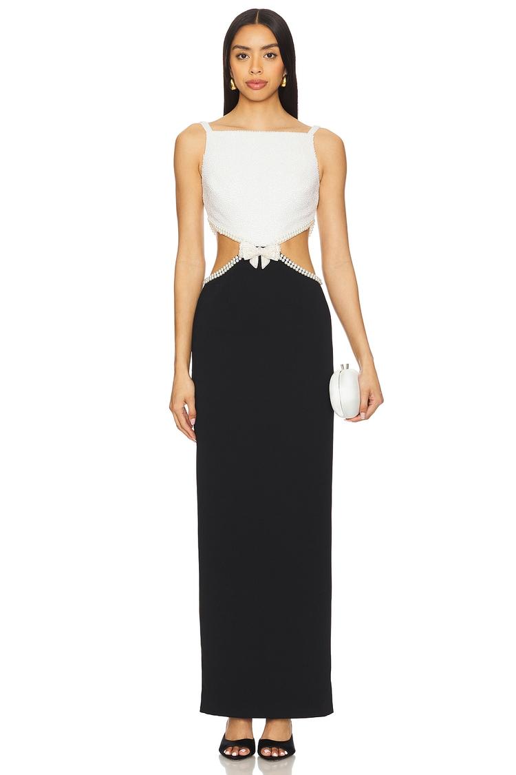A striking crepe maxi dress features a fitted column silhouette with elegant side cut-outs and a hidden back zip closure. The straight neckline and sleeveless design highlight the sophisticated bow and faux pearl embellishments at the front bodice, while the heavyweight crepe fabric adds structure and refinement. Perfectly suited for formal events, cocktail parties, and wedding guests, this dress blends modern glamour with timeless elegance. The clean hemline and fully lined construction ensure a polished finish that transitions beautifully through all seasons.