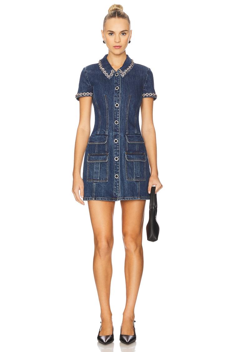 Heavyweight denim in a fitted mini silhouette with a classic collar and front snap button closure defines this chic shirt dress. Crystal embellishments along the neckline add a touch of sparkle, while the four-pocket design enhances its casual cool vibe. Featuring cuffed short sleeves and a clean hemline, this versatile piece is perfect for casual outings, brunch dates, or streetwear styling. Crafted from cotton blend fabric with intentional fading, it balances modern style with everyday comfort for spring through autumn wear.