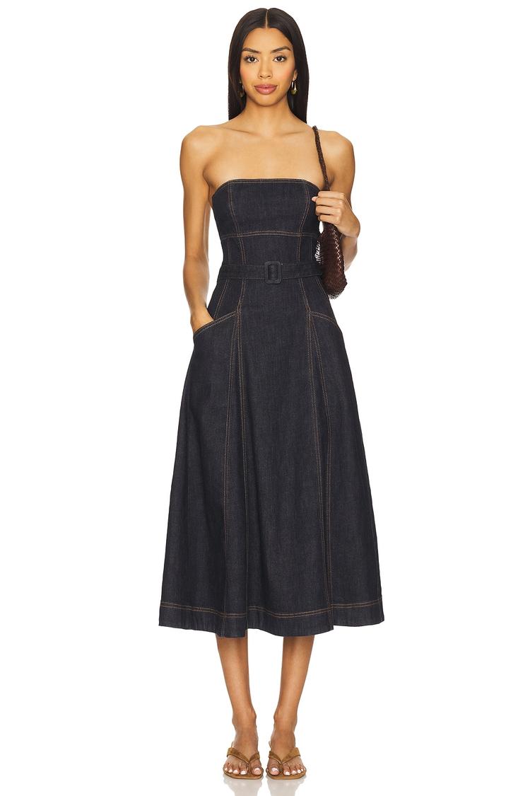 Structured denim fabric shapes a sleek strapless midi dress featuring a fitted bodice and a belted waist detail that accentuates the silhouette. The clean hemline and side pockets add both style and practicality. With a back zipper closure and a timeless A-line cut, this versatile dress suits spring and summer occasions such as brunch, date nights, and cocktail events. Crafted in a dark matte blue cotton blend, it offers a chic yet classic look for effortless, polished wear.