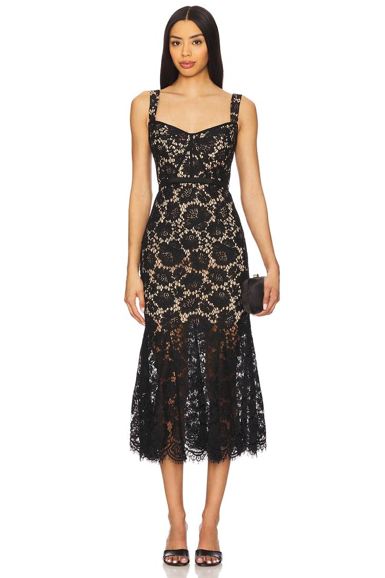 Delicate matte black lace covers a fitted, midi-length silhouette that embraces a classic fit and flare style. The sweetheart neckline and wide straps highlight the shoulders, while the sleeveless cut and boned sides ensure structure and elegance. Featuring a concealed back zipper with hook and eye closures and a detachable waist belt, this dress is crafted from midweight lace fabric with an attached bust lining. Ideal for cocktail parties, date nights, and semi-formal events, it offers timeless sophistication and versatile wear throughout spring, summer, and autumn.