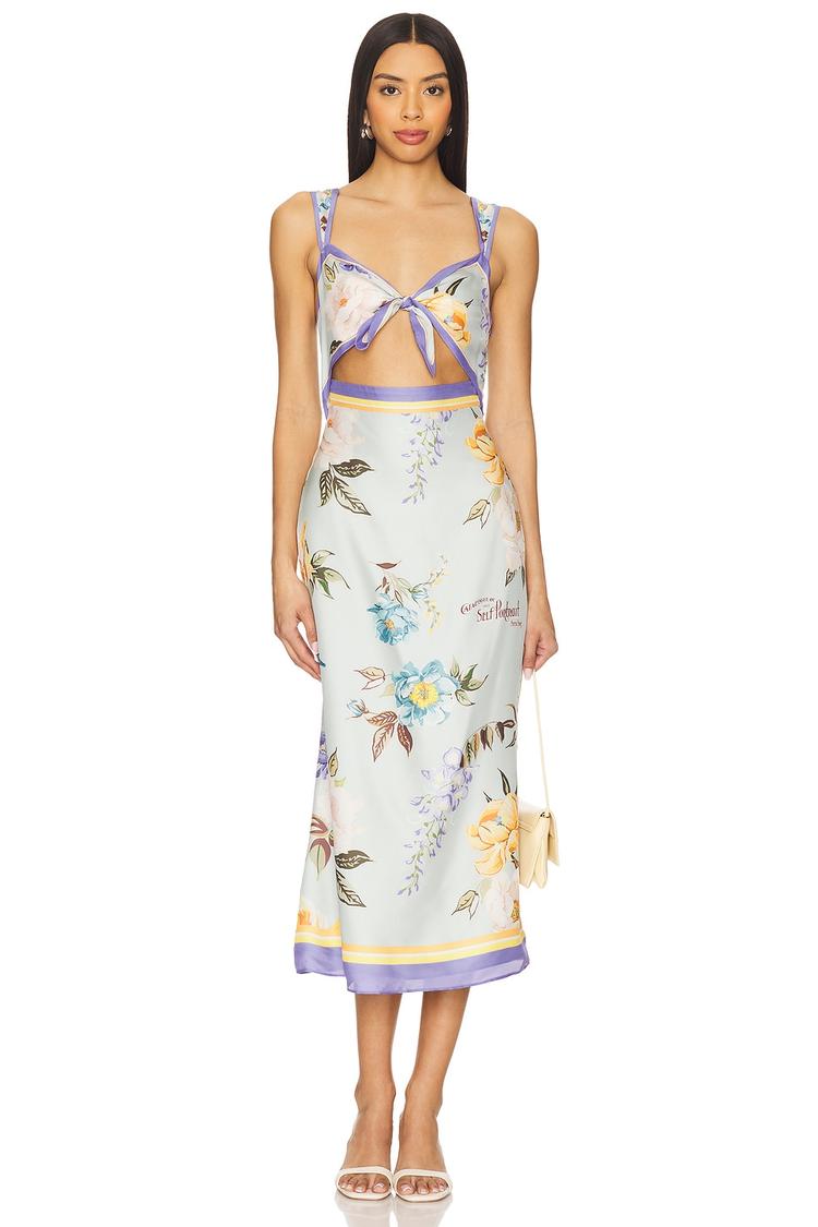Soft silk satin in a floral print pairs with a slim, midi slip silhouette featuring delicate spaghetti straps and a tie-back detail. The V-neckline and sleeveless cut enhance its romantic and elegant appeal. This midi dress blends modern design with timeless femininity, perfect for spring and summer occasions like brunch, date nights, or cocktail parties. The floral pattern in muted purple, yellow, blue, green, and brown hues adds subtle color contrast over an off-white base, while the clean hemline completes the refined look.