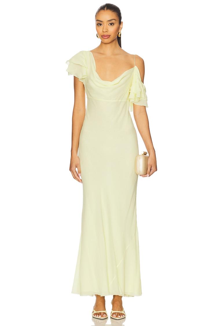 Soft matte light beige crepe fabric shapes a sleek column silhouette with a flattering slim fit, perfect for spring and summer evenings. The maxi length and clean hemline add elegant flow, while the distinctive cowl neckline and drop-shoulder ruffled sleeves bring a modern, feminine edge. Concealed side zipper ensures a smooth fit, making this dress ideal for cocktail events, date nights, or formal occasions where understated sophistication is key.