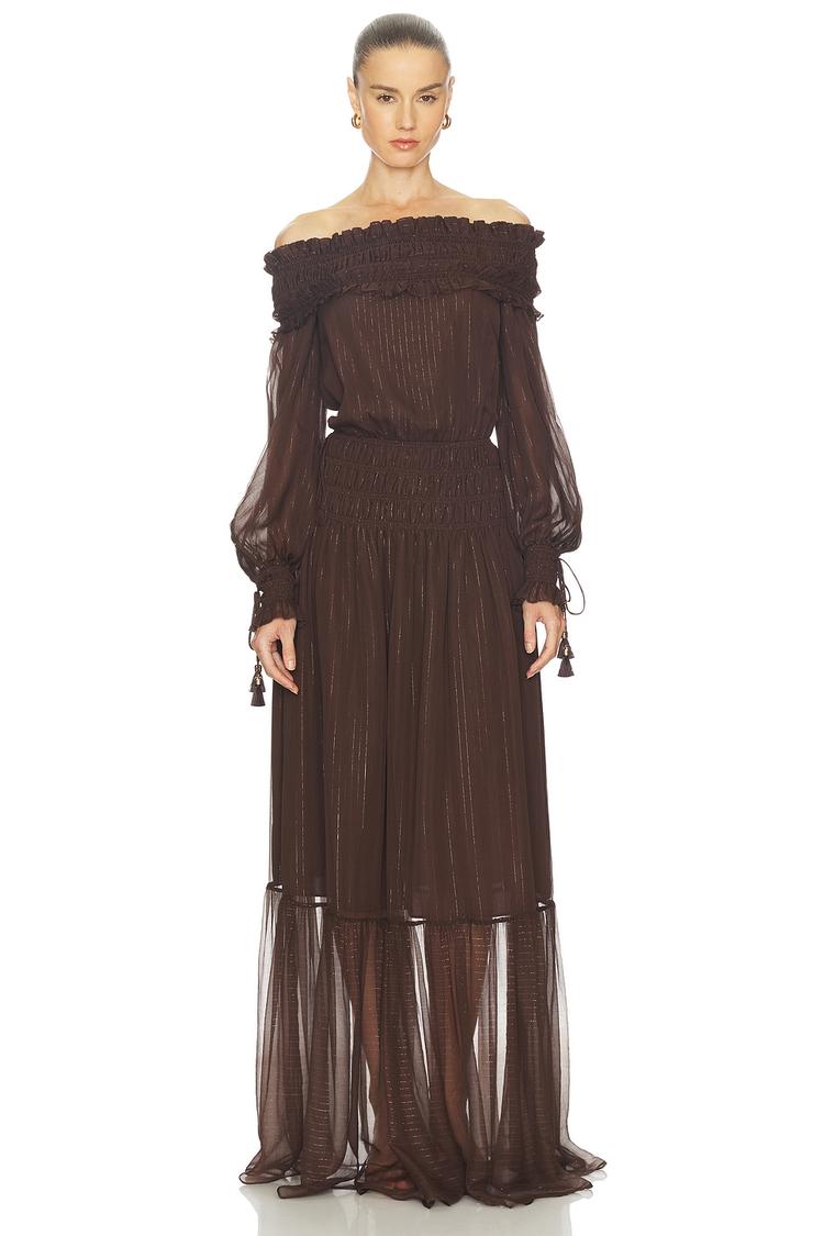 Soft georgette fabric and a flowing maxi silhouette define this romantic off-shoulder dress. Featuring long sleeves with delicate ruffled details at the neckline, cuffs, and hem, it creates an elegant yet effortless look. The elasticized waistband adds gentle shaping, enhancing the regular fit that skims gracefully over the body. Perfect for spring and autumn evenings, this matte brown maxi dress suits cocktail parties, formal events, and date nights with its ethereal charm and classic style.