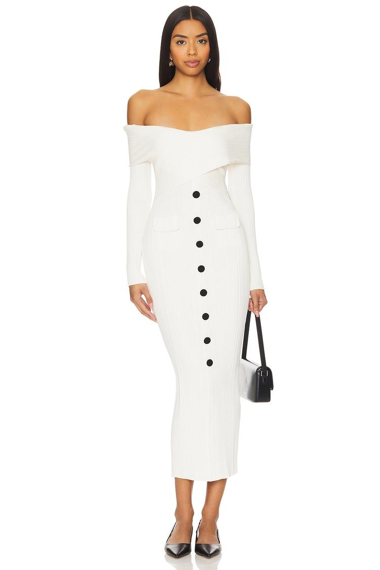 A sleek off-shoulder neckline and long fitted sleeves frame this elegant midi sheath dress crafted from a midweight ribbed jersey blend. The clean white fabric contrasts strikingly with the row of black faux buttons and subtle front bow details, creating a sophisticated minimalist silhouette. Designed for versatility, this pull-on dress offers comfort with a slip-on closure and silicone grip trim for a secure fit. Ideal for cocktail parties, date nights, or stylish brunches, it exudes effortless chic for all seasons.