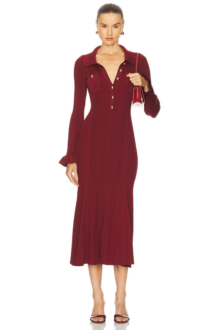 A ribbed knit midi dress in a rich matte burgundy hue, featuring a fitted sheath silhouette that flatters every curve. The elegant V-neckline and long sleeves with delicate ruffle cuffs add a sophisticated touch, complemented by a partial front button closure for subtle detailing. Crafted from a midweight blend of viscose, polyester, and polyamide, this dress offers comfort and stretch. Ideal for autumn and winter occasions, it transitions effortlessly from business casual meetings to cocktail evenings and date nights with understated style and charm.