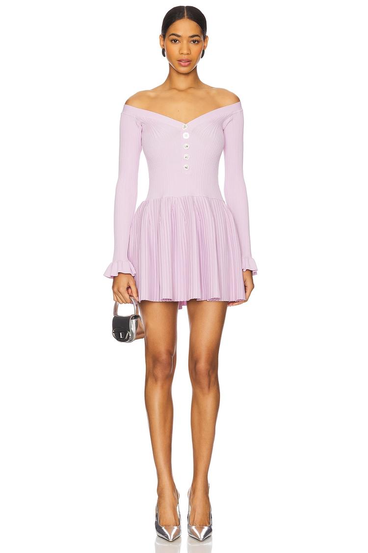 Soft ribbed knit fabric and a flared mini silhouette define this off-shoulder dress, finished with charming ruffled hems on the sleeves and skirt. The light lilac hue adds a fresh, modern vibe ideal for spring and summer outings. Its pull-on, slip-on design ensures effortless comfort while the fitted bodice accentuates the waist before flaring into a playful skirt. Versatile enough for casual brunches, date nights, or relaxed daytime events, this dress combines feminine details with contemporary ease.