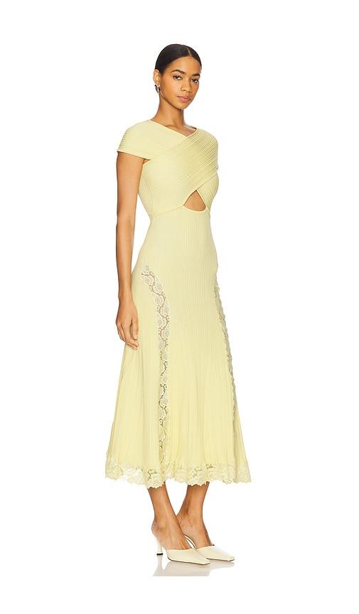 SELF-PORTRAIT KNIT LACE INSERT MIDI DRESS IN YELLOW.