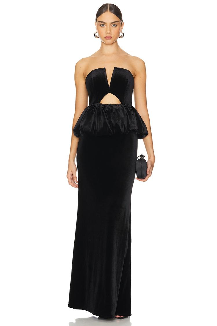 The sleek silhouette of this matte black velvet column dress is elevated by a strapless straight neckline and a flattering fitted cut. A peplum ruffle detail accents the waist with a bold front cut-out, while the back features a hidden zipper closure for a seamless finish. Crafted from a luxurious polyester-elastane blend velvet, this maxi length gown offers a sophisticated look perfect for formal events, cocktail parties, and elegant nights out. Its underwire support and clean hemline complete a poised and polished ensemble.