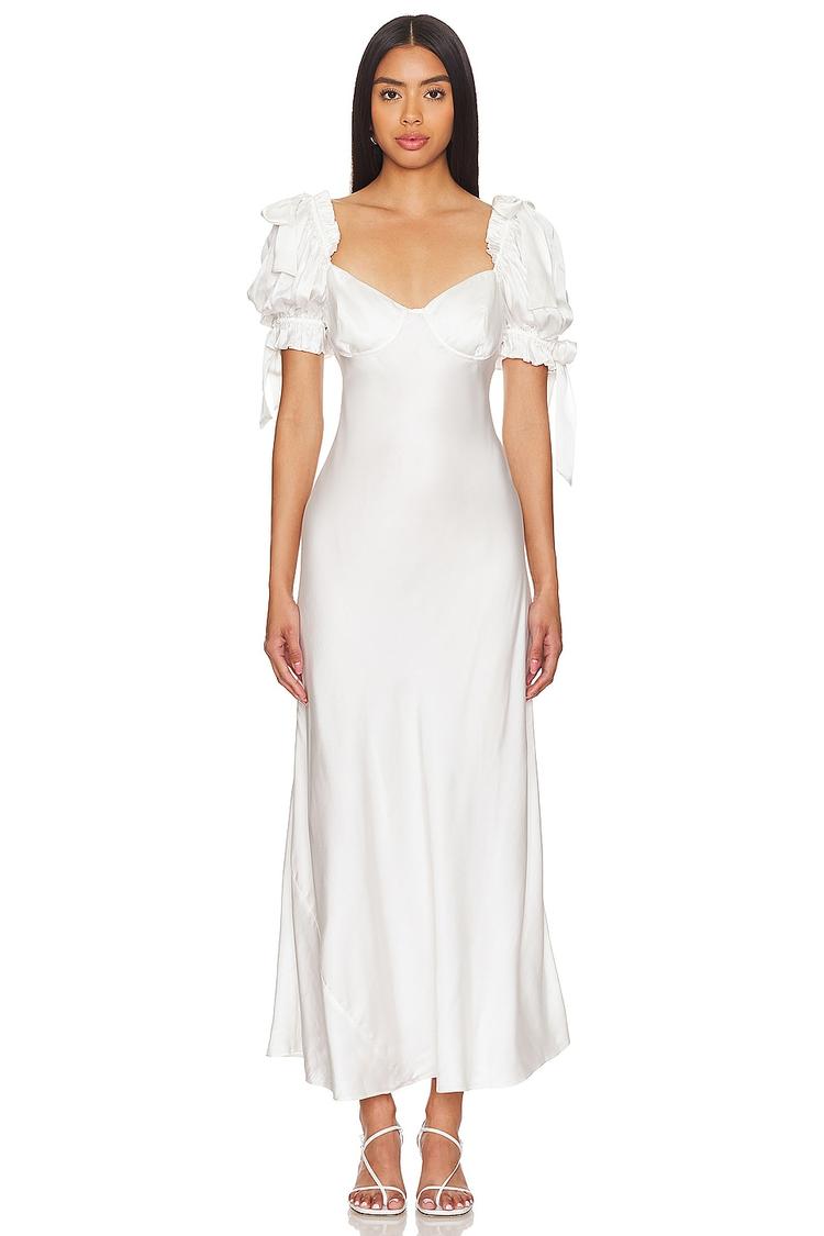 Soft silk charmeuse drapes in a flowing maxi silhouette with a slim fit that contours the bust, enhanced by a romantic sweetheart neckline. The half puffed sleeves with delicate ribbon ties at the cuffs add an elegant, vintage-inspired touch. A keyhole back with a loop button closure completes the look, making this slip dress ideal for spring and summer evenings. Its lightweight satin fabric and clean hemline ensure graceful movement, perfect for cocktail events, formal occasions, or a memorable date night.