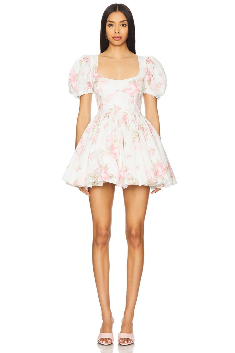 Soft cotton-linen blend and a flared A-line silhouette shape this charming mini dress with a romantic square neckline and puffed half sleeves featuring elastic cuffs. The playful pleated skirt with ruffled hem adds a whimsical touch to the dusty rose floral print on a crisp white base. Perfect for spring and summer brunches, date nights, or cocktail events, this fitted dress combines classic style with cute, feminine details for versatile wear.