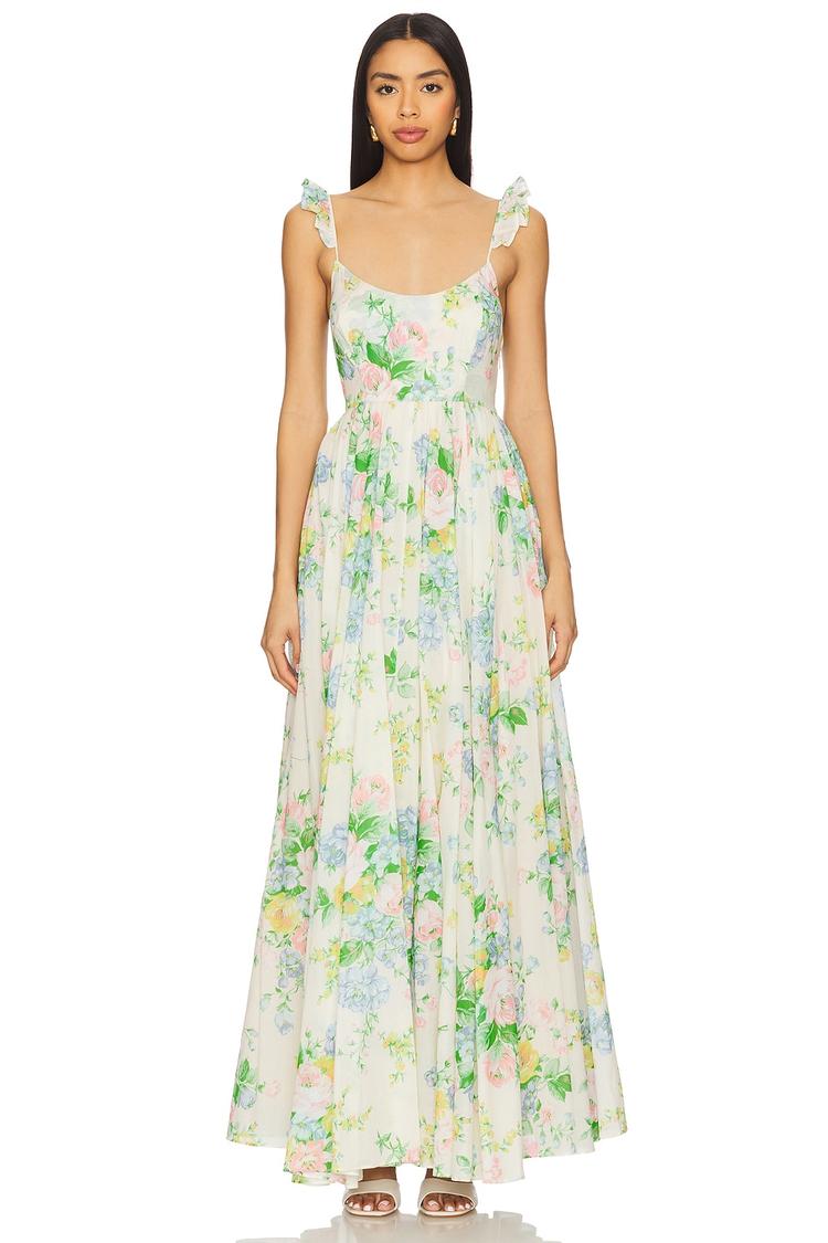 Soft cotton fabric and a flowing A-Line silhouette create an effortlessly romantic maxi dress perfect for spring and summer occasions. The floral print blooms all over an off-white base, accented by delicate ruffled shoulder straps and a flattering square neckline. An open back adds a touch of allure, while the hidden side zipper ensures a seamless fit. Ideal for brunches, outdoor events, or date nights, this dress combines comfort with bohemian charm and casual chic style.