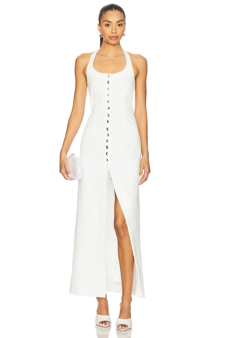 Effortless elegance defines this white midi shift dress featuring a slim fit and a halter neck silhouette. Crafted from a comfortable cotton-linen blend, it showcases a front button closure with unique silver-tone irregular buttons that add subtle charm. Sleeveless with a clean hemline, this minimalist piece is perfect for spring and summer outings, whether it's a casual brunch, a relaxed beach day, or a stylish date night. The versatile design and breathable fabric make it an ideal addition to your warm-weather wardrobe.