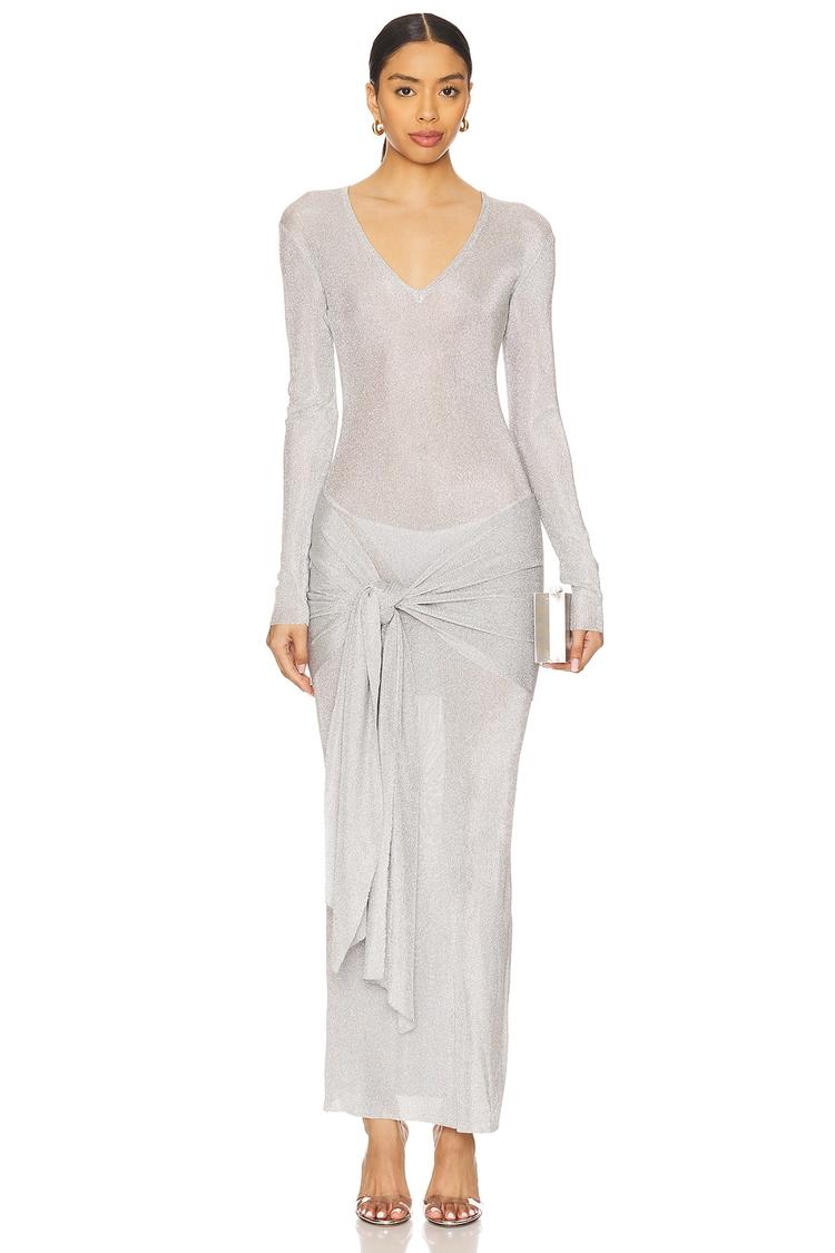 Soft metallic knit in a fitted sheath silhouette features a flattering V-neck and long sleeves for a sleek look. The front wrap accent with a tie closure adds elegant draping detail, while the maxi length offers graceful coverage. Crafted from a heavyweight viscose-lurex blend, this semi-sheer dress shimmers subtly, perfect for cocktail parties, date nights, or evening events. Its minimalist design and sophisticated style make it a versatile choice for stylish occasions year-round.