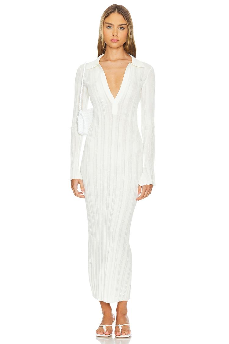 A sleek column silhouette in a slinky knit fabric creates an elegant and sophisticated look with a plunging neckline and long sleeves. The maxi length enhances the dress’s refined appeal, while the semi-sheer viscose blend fabric adds subtle allure perfect for date nights, cocktail events, or nights out. Its minimalist design and fitted cut offer a polished yet comfortable fit, suitable for all seasons. This versatile dress pairs beautifully with heels for a confident and modern statement.