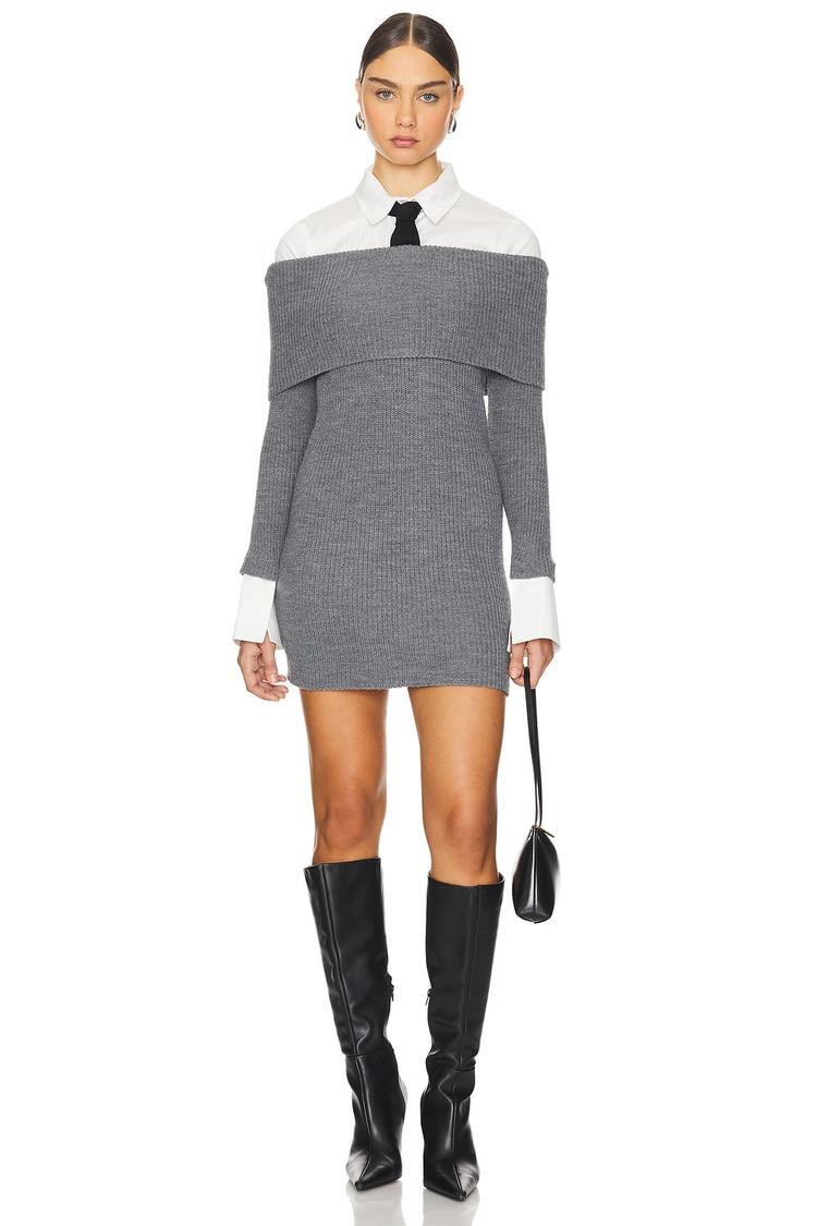 Ribbed knit fabric and a sleek off-shoulder neckline define this fitted mini sweater dress, combining warmth with a refined silhouette. The detachable white shirt collar and cuffs add versatility and a polished business chic touch, complemented by the included black knit tie. Ideal for autumn and winter, this classic yet modern dress suits casual days, workwear, and business casual events. Its clean hemline and long sleeves complete the look, offering a sophisticated layering piece crafted from a cozy blend of viscose, polyester, acrylic, cotton, and wool.