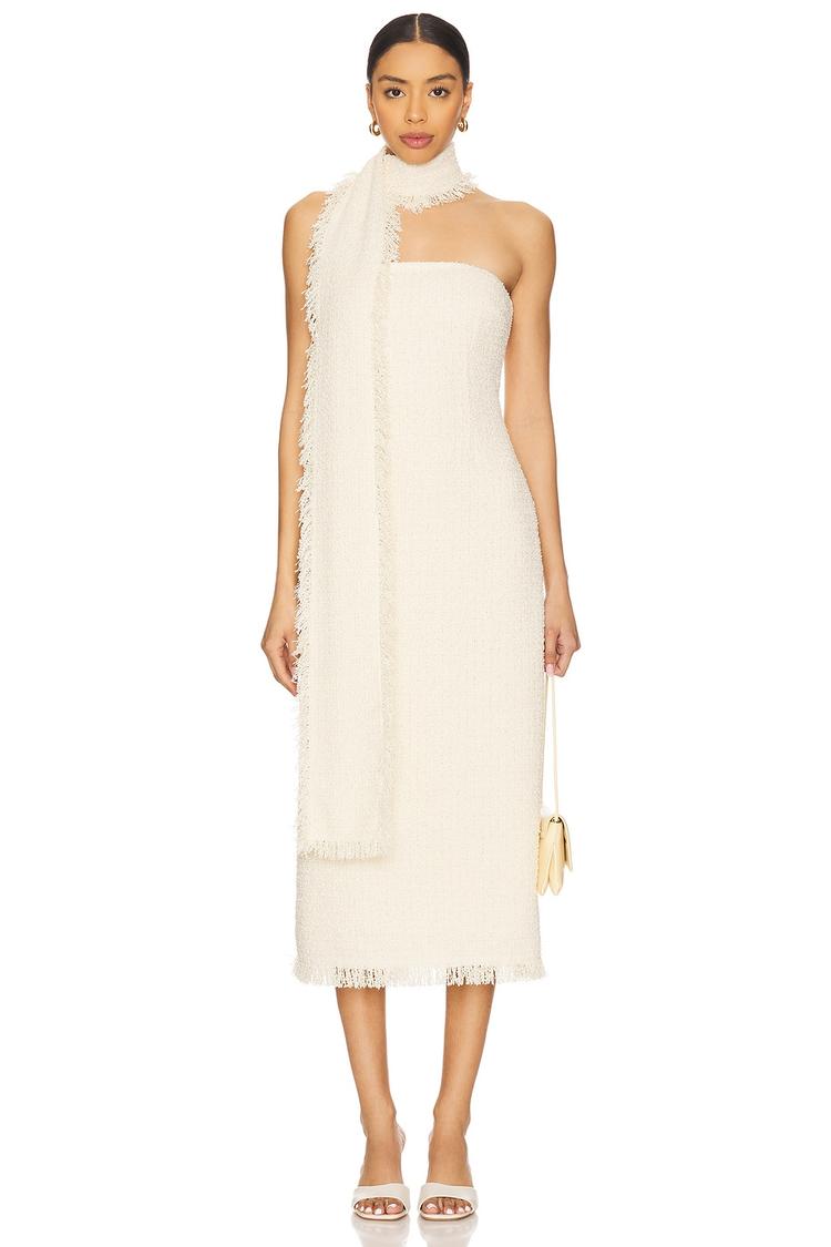 A sophisticated cream boucle sheath dress featuring a straight neckline and strapless silhouette, crafted from heavyweight tweed polyester fabric. The midi length and fitted cut highlight an elegant and classic style, enhanced by delicate fringe trim running all over the garment. The concealed back zipper ensures a seamless finish to the covered back, while the optional scarf styling adds versatility. Ideal for cocktail parties, formal occasions, and semi-formal events, this dress offers timeless elegance with a modern touch for year-round wear.