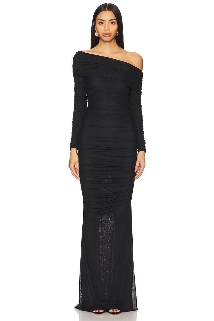 Elegant and sophisticated, this matte black column gown features a striking asymmetric neckline and long sleeves for a sleek silhouette. Crafted from heavyweight slinky jersey fabric with a blend of polyester and spandex, it offers a fitted shape enhanced by ruched sides for texture and dimension. The maxi length with a clean hemline adds timeless glamour, making it ideal for cocktail parties, formal events, and gala evenings. The hidden side zipper ensures a seamless finish, while the fully lined construction provides comfort and polish for any upscale occasion.