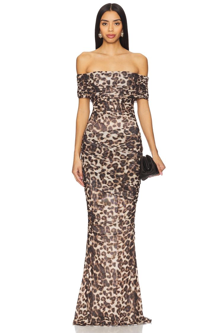 A sultry column silhouette in a maxi length, this off-shoulder dress features a foldover straight neckline that frames the shoulders elegantly. Crafted from heavyweight mesh polyester-spandex fabric, it offers a fitted shape enhanced by ruched detailing throughout. The bold animal print in warm browns and blacks adds a modern sexy vibe, making it perfect for cocktail parties, night outs, or date nights. The concealed side zipper ensures a smooth fit, while the clean hemline maintains sleek sophistication for versatile all-weather wear.
