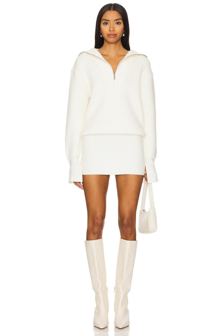A sleek off-white sweater dress crafted from slinky knit acrylic and nylon blend offers a slim fit and mini length ideal for cooler months. The foldover neckline and partial hidden front zipper add subtle design interest while maintaining minimalist elegance. Long regular sleeves and a clean hemline complete the look. This versatile dress suits casual outings, brunch dates, and relaxed evenings, blending cozy comfort with contemporary style.