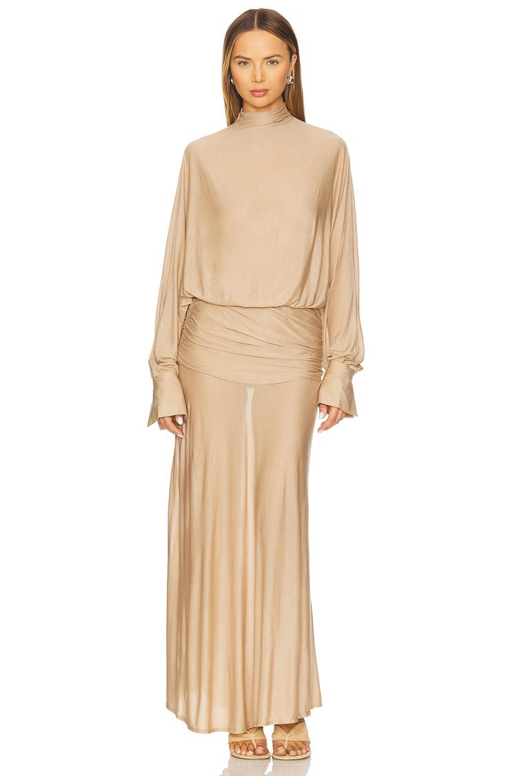 Matte beige lyocell fabric with a semi-sheer quality gives this elegant column gown a sophisticated allure. The maxi length flows gracefully with a clean hemline, while long cuffed sleeves and a high neck add refined coverage. Subtle ruching at the waist creates gentle texture and flattering definition. Button closure at the collar enhances the minimalist vibe. Ideal for formal occasions, cocktail events, and wedding guest attire, this gown blends comfort with chic style across seasons.