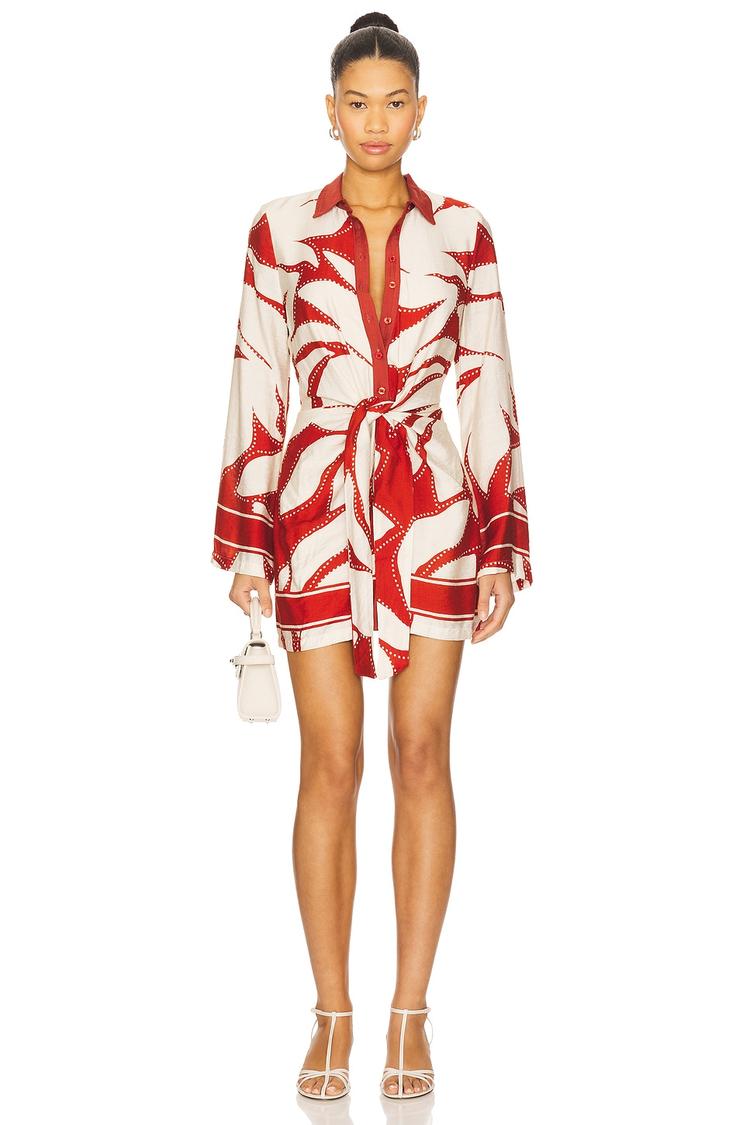 Bold abstract red and white prints energize this mini shirt dress, crafted from a midweight rayon-nylon blend that offers structure and comfort. Featuring a classic collar neckline and long sleeves, its regular fit is enhanced by a front button closure and a waist tie belt that defines the silhouette. The clean hemline and fully lined interior add polished details. Ideal for casual brunches, date nights, or vacation getaways, this versatile piece balances modern style with easy wearability.