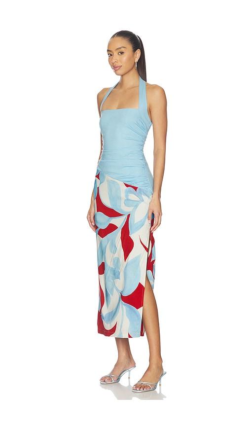 SEVEN WONDERS EVIE HALTER RUCHED MIDI DRESS IN BLUE,RED.