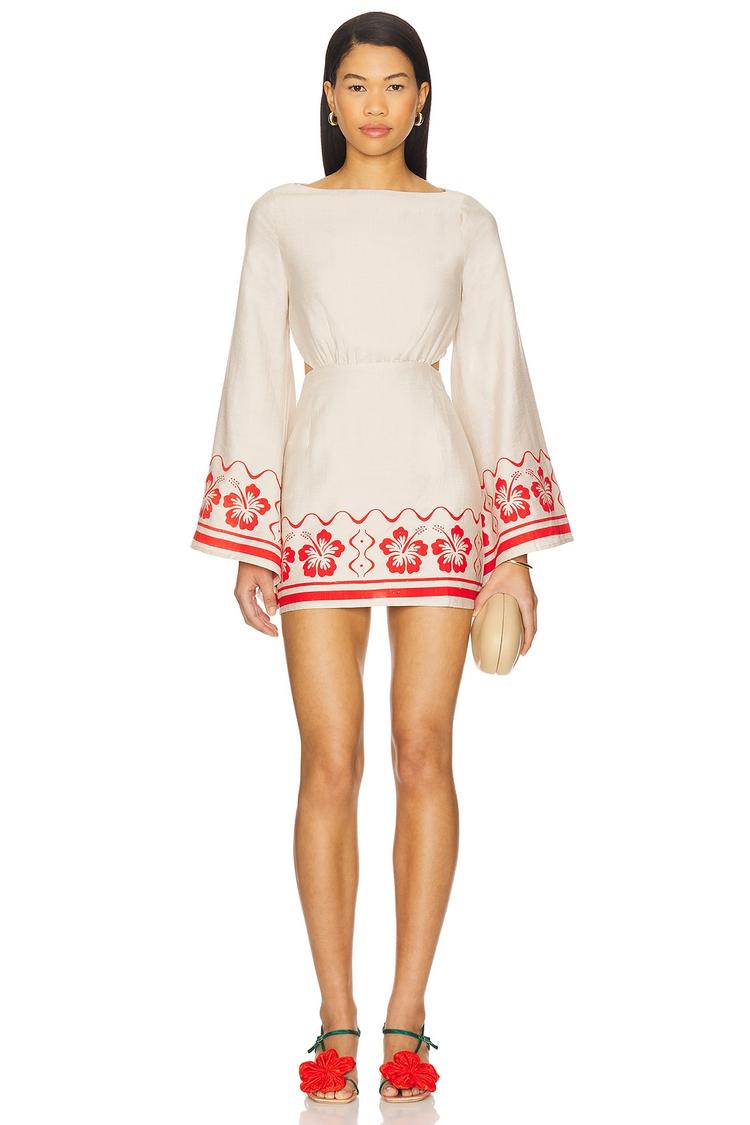 Soft rayon and linen blend fabric shape a relaxed shift silhouette mini dress featuring dramatic bell sleeves and a round neckline. The off-white base is accented with striking red floral border prints along the hem and sleeve edges. A concealed side zipper and elasticated back ensure comfortable fit, while the open back cut-out adds a breezy, bohemian flair. Ideal for spring and summer brunches, date nights, or cocktail parties, this Isla Mini Dress combines effortless style with vibrant detailing for versatile warm-weather wear.
