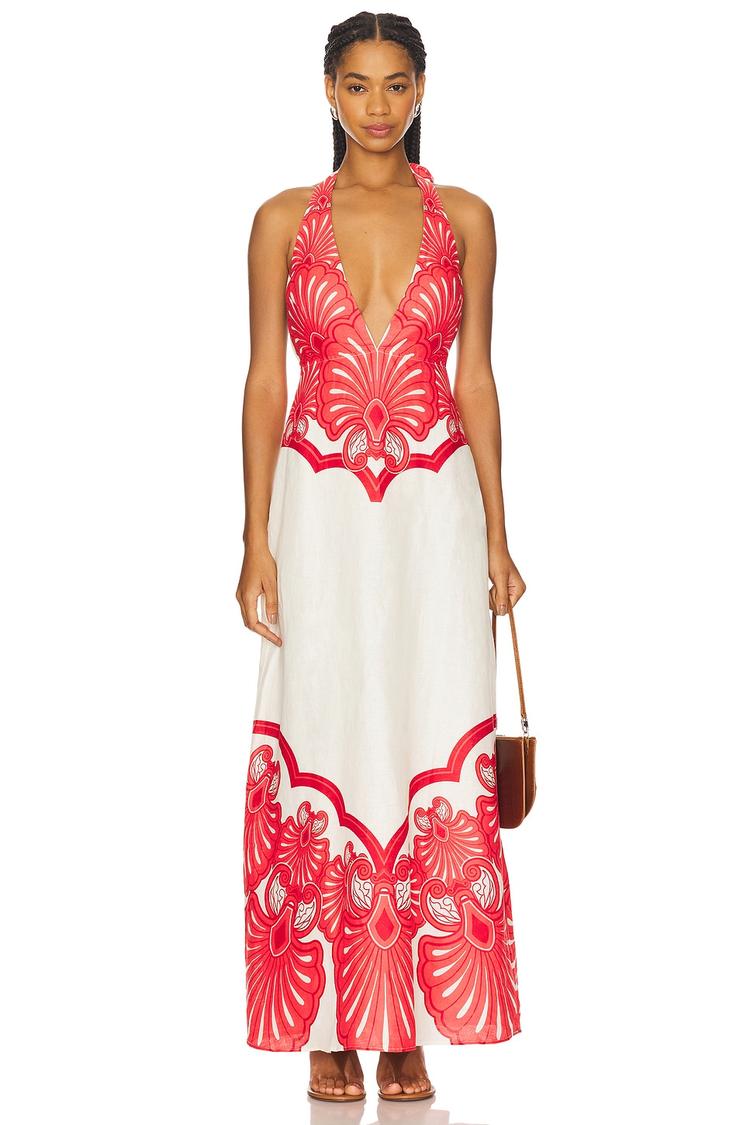 Sunlit summer days and beachside evenings come alive with this slim-fitting column maxi dress crafted from midweight linen and cotton lining. The halter neckline with a self-tie closure and open back design adds an elegant, romantic touch, while the vibrant red floral pattern on a crisp white base evokes a bohemian charm. The side zipper ensures a sleek silhouette, making it perfect for vacation getaways, brunch dates, or outdoor events.