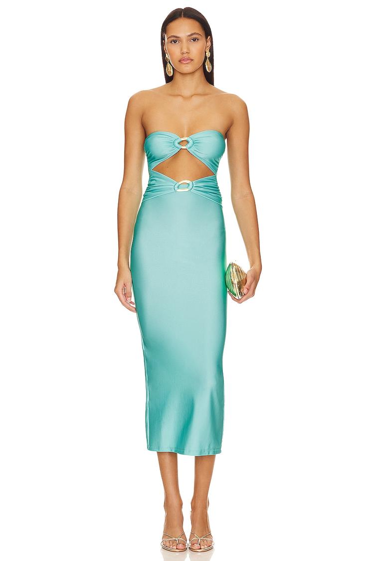 Soft shimmer aqua satin fabric flows into a bodycon slip dress that perfectly contours the figure. Featuring a straight neckline and strapless styling, this midi-length dress highlights bold front cut-outs at the bodice for a sexy, modern edge. The covered back and clean hemline complete its sleek silhouette. Ideal for date nights, cocktail parties, or nights out, this elegant dress embodies contemporary glamour with a touch of sophistication for spring and summer occasions.