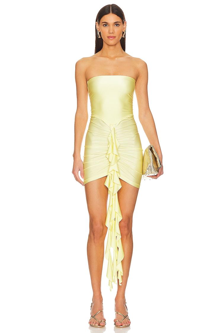 Semi-sheen jersey fabric and a bodycon sheath silhouette combine to create a bold yet elegant mini dress. The straight, strapless neckline accentuates the shoulders, while the front cascading ruffle adds a dramatic focal point. Perfect for warm spring and summer nights, this pull-on style offers comfort with its stretchy nylon and elastane blend. Ideal for night outs, cocktail parties, and date nights, it delivers a trendy, sexy vibe with clean lines and a shimmering pale yellow hue that catches the light beautifully.