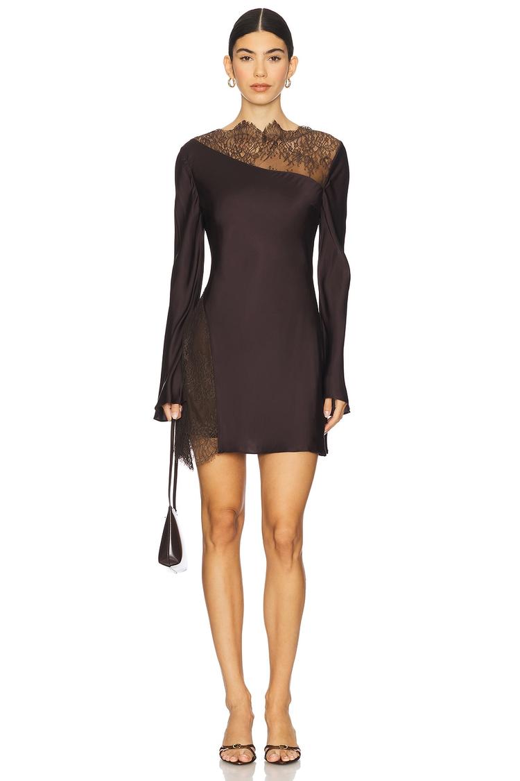 Matte black charmeuse fabric with sheer lace panels defines this elegant mini shift dress, designed with a high neckline and long sleeves for a sophisticated silhouette. The concealed back zipper ensures a clean finish, while lace detailing on the bodice, sleeves, and side adds a subtle allure. Its regular fit and mini length make it perfect for cocktail parties, night outs, or romantic date nights during the cooler autumn and winter seasons. Fully lined with lightweight charmeuse, this dress offers both comfort and style in one sleek package.