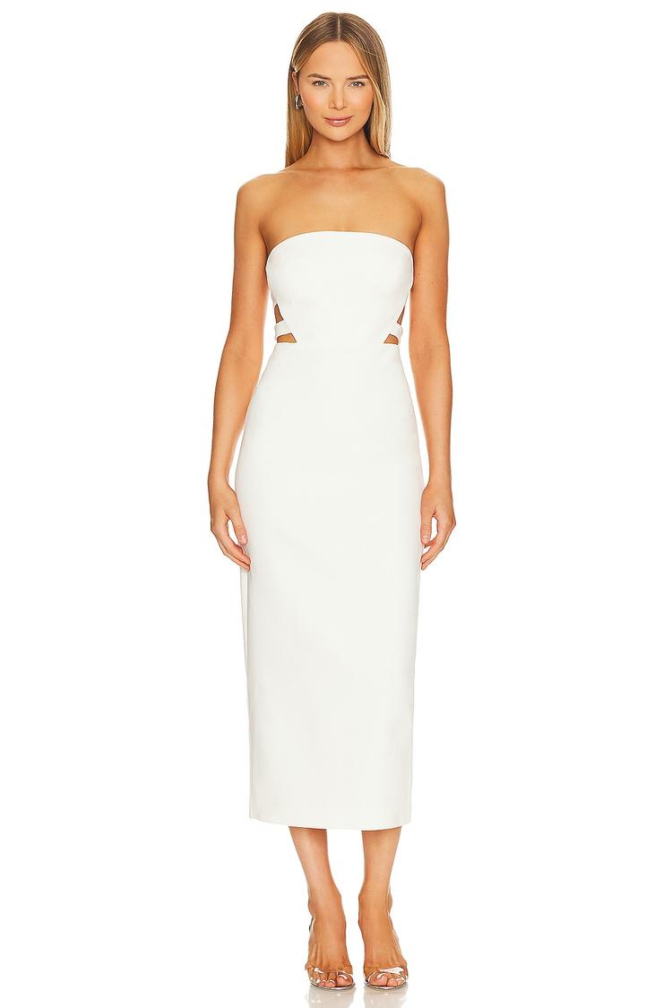 Clean lines and a sleek silhouette define this elegant white sheath midi dress crafted from crepe jersey fabric. The fitted cut beautifully contours the body, featuring a straight strapless neckline and daring side cut-outs with a strappy back for a modern, sexy touch. Perfectly versatile, this fully lined dress with a hidden back zipper and back vent suits cocktail parties, date nights, and evening outings with ease. Its refined simplicity and subtle detailing ensure you stand out with sophisticated charm.