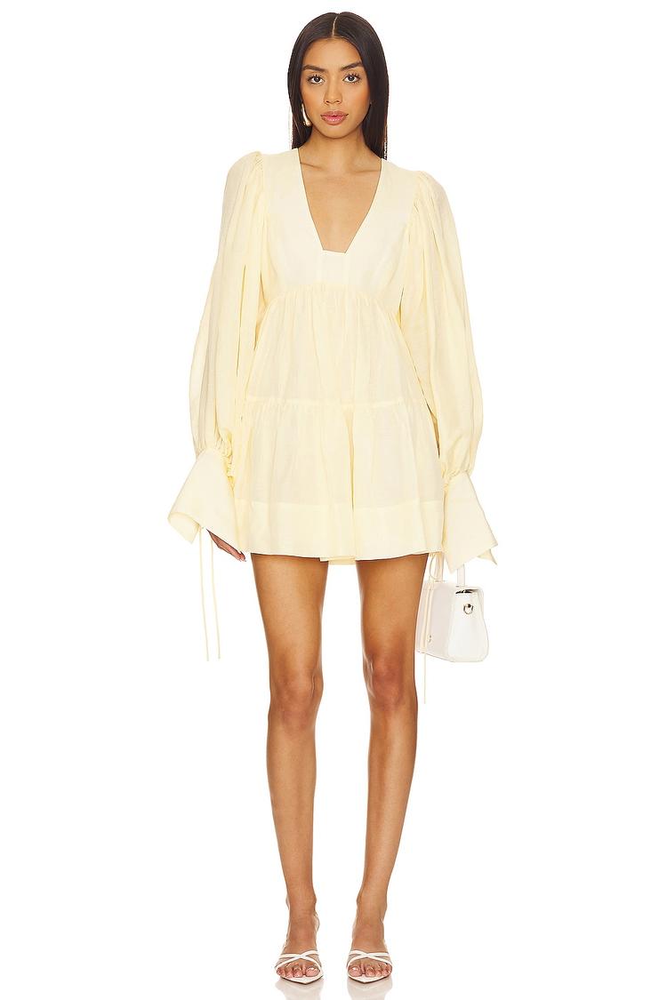 Soft linen fabric and a loose swing silhouette create a breezy, effortlessly chic look with this mini dress. Featuring a deep V-neckline and long blouson sleeves with bell cuffs finished by delicate tie closures, it offers a relaxed yet feminine vibe. The subtly ruffled hem adds playful movement, perfect for warm spring and summer days. Hidden side zipper closure ensures a smooth fit, making it ideal for brunch outings, casual date nights, or laid-back daytime events. This versatile dress combines comfort with modern style, showcasing an understated elegance in a matte beige tone.