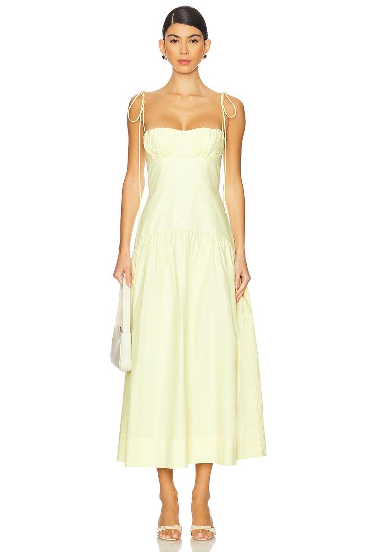 Soft matte cream cotton crepe shapes a fitted A-Line midi dress with a flattering sweetheart neckline and adjustable tie shoulder straps that add a delicate ruffle detail. The concealed back zipper and fully lined finish ensure comfort and elegance. This classic, minimalist silhouette is perfect for spring and summer occasions, from brunches and date nights to cocktail events, offering a versatile and refined look with breathable organic cotton fabric.