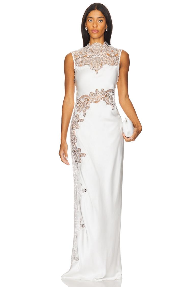 Midweight satin fabric combined with delicate lace cut-out detailing creates a refined silhouette in this column maxi dress. The sleeveless design features a graceful mock neck and a covered back with elegant button loop closure, perfect for formal events, cocktail parties, or wedding guest appearances. Its slim fit and clean hemline enhance the sophisticated aesthetic, while the fully lined viscose and nylon blend ensures comfort and quality. Ideal for year-round wear, this dress embodies timeless elegance with a modern touch.