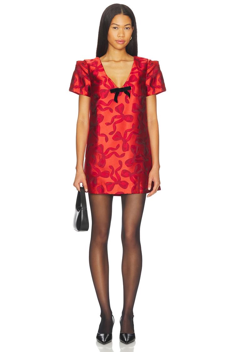 Shimmering red polyester fabric with an abstract pattern defines this chic mini shift dress. The flattering V-neck and half sleeves add classic elegance, while the matte black velvet bow at the front provides a standout design detail. Fully lined for comfort, it features functional side seam pockets and a clean hemline, perfect for effortless slip-on styling. Ideal for date nights, cocktail parties, and semi-formal events, this versatile dress combines timeless style with modern practicality.