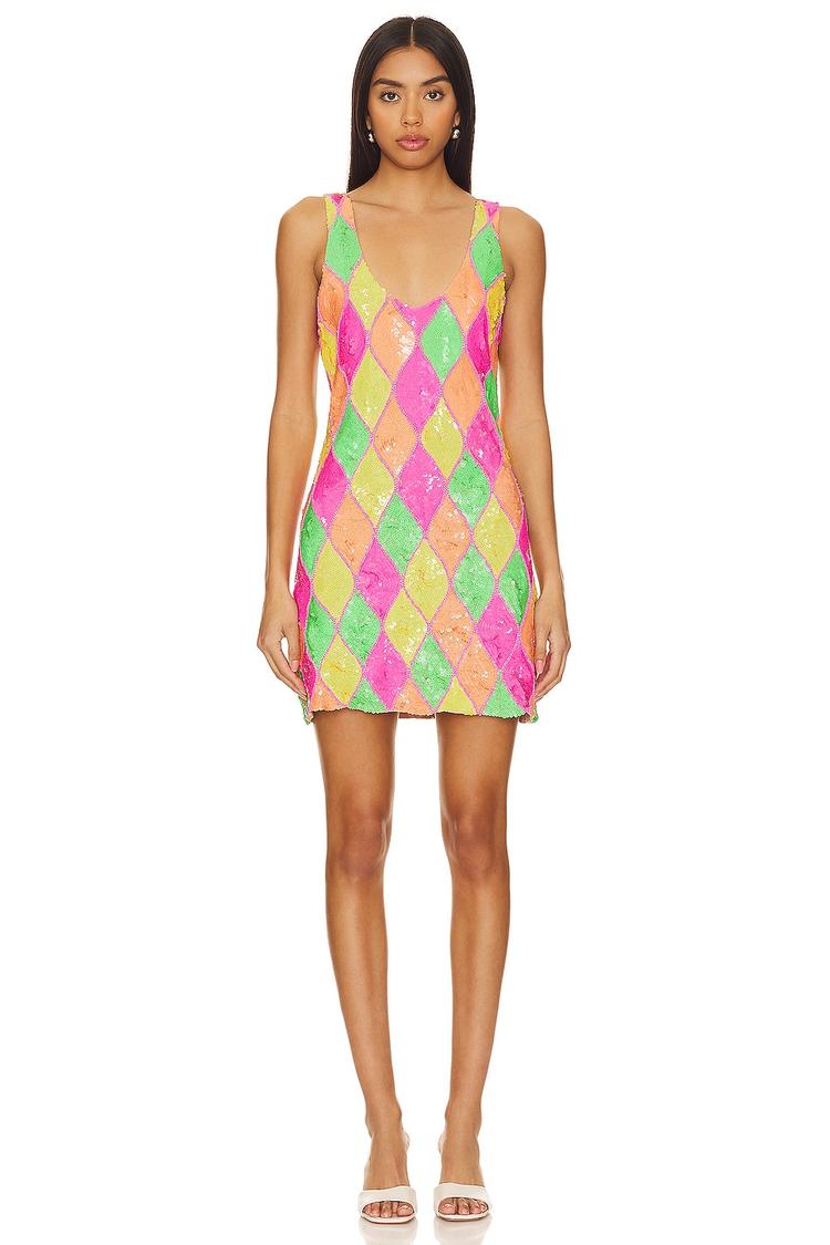 Shimmering sequins in vibrant pink, lime, and yellow create a playful geometric pattern on this mini shift dress, perfect for warm weather festivities. The plunging back and wide straps add a sexy, modern edge while the slim fit flatters the silhouette. Crafted from a stretchy nylon-elastane blend with a polyester lining, it ensures comfort and ease with a pull-on style. Ideal for cocktail parties, nights out, or lively celebrations, this dress brings a bold, trendy vibe to your spring and summer wardrobe.