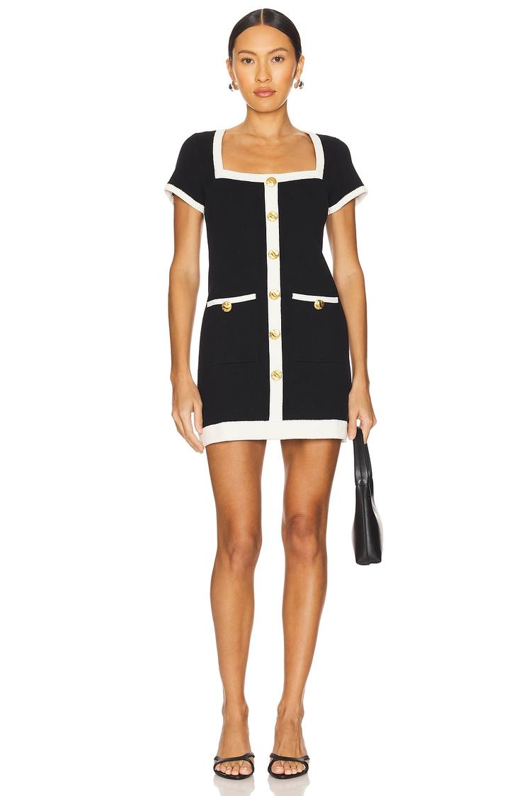 Matte black cotton-nylon blend fabric shapes this chic sweater dress with a fitted mini silhouette and contrasting matte white trims that highlight the square neckline, short sleeves, and hem. Gold-tone buttons run down the front, adding a classic preppy touch along with functional front pockets. The clean hemline and covered back maintain a polished look, making it an ideal choice for casual days, business casual settings, or stylish workwear during spring and autumn.