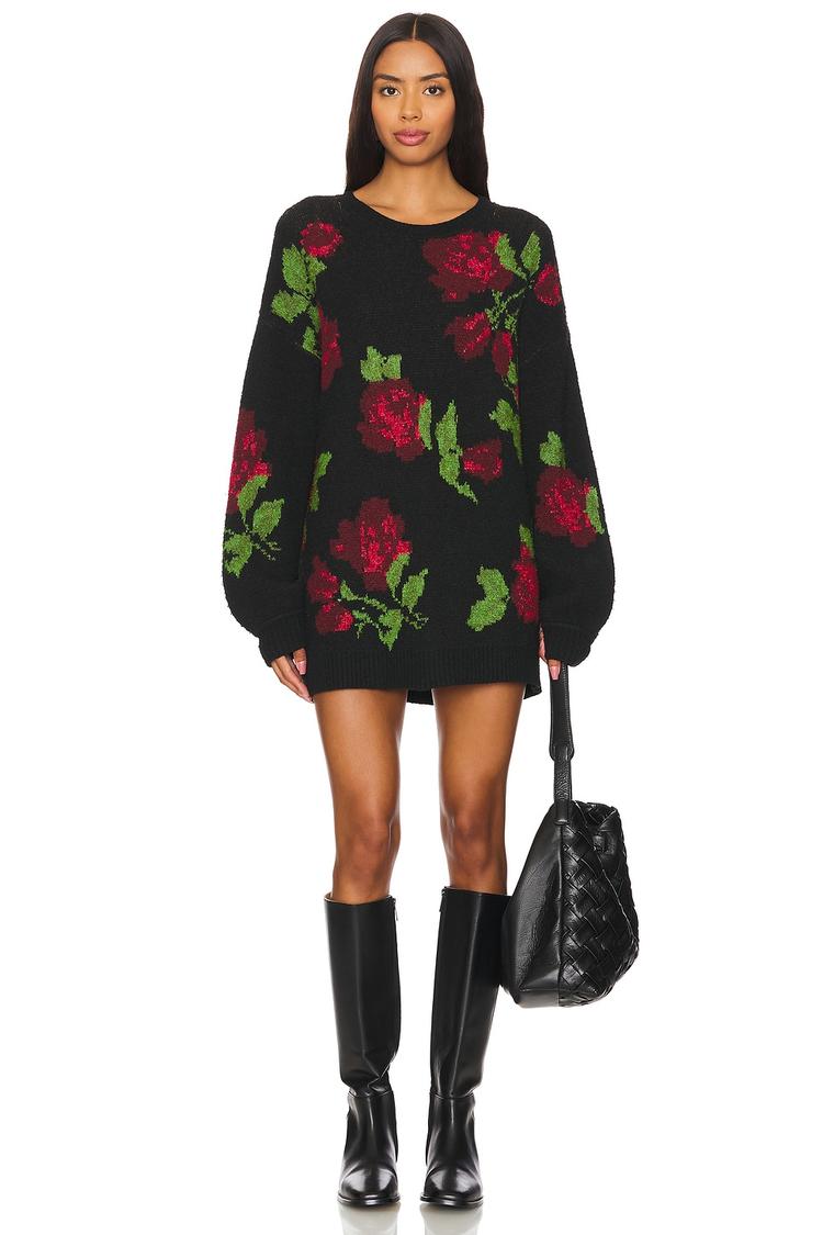 Sleek black knit fabric adorned with vibrant red roses and green leaves creates a striking floral motif on this mini sweater dress. The loose fit and long balloon sleeves paired with a classic crew neck offer cozy comfort and stylish ease. Perfect for casual autumn or winter outings, this slinky polyester blend piece is ideal for everyday wear, brunch dates, or relaxed weekend adventures. The clean hemline and pull-on slip-on styling enhance its effortless chic vibe, making it a versatile addition to your cool-weather wardrobe.