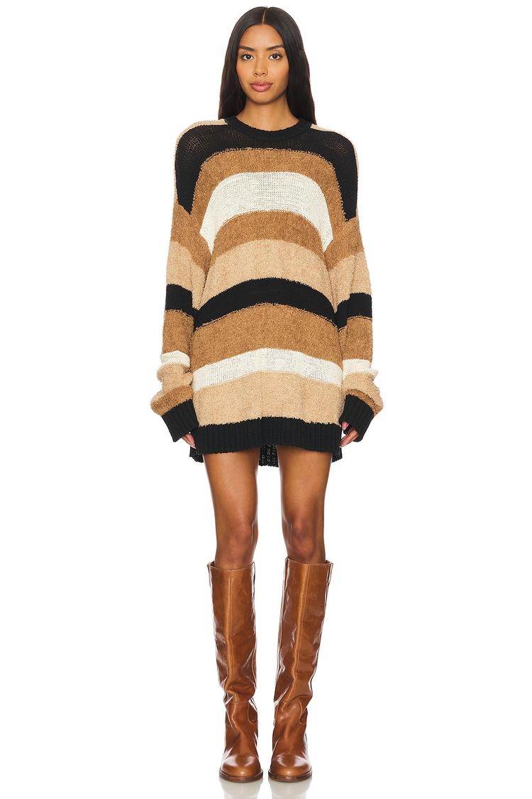 Cozy and effortlessly stylish, this striped tunic features a loose fit and long sleeves crafted from a soft cotton-nylon blend knit. The round neckline and clean mini hemline complement its casual chic vibe, perfect for layering in autumn and winter. Its pullover design and relaxed silhouette make it an ideal choice for everyday wear, brunch outings, or casual street style looks. The warm beige base with black and off-white stripes adds visual interest while maintaining versatility, making this tunic a cozy staple for cooler seasons.