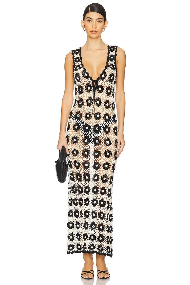 Heavyweight cotton crochet fabric and a loose, shift silhouette define this maxi vacay tank dress. The sleeveless wide straps and deep V-neckline create an airy, summery appeal, while the front lace-up tie adds a subtle design detail. Its sheer construction with intricate black lace trim all over offers a bohemian vibe perfect for beach days, casual brunches, or relaxed date nights in warm weather. The clean hemline and covered back complete the look, making it a stylish yet comfortable choice for effortless summer style.