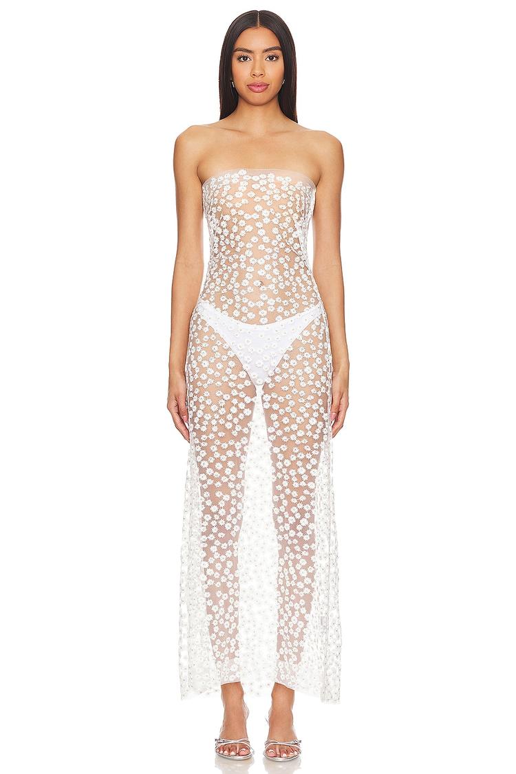 Soft, sheer mesh fabric adorned with delicate white floral appliques creates an elegant and sexy column silhouette. The strapless neckline and slim fit enhance the modern appeal, while the maxi length adds sophistication. An exposed side zipper ensures a sleek closure. This sheer embroidered dress is perfect for summer and spring occasions like cocktail parties, night outs, or brunch events. Its transparency paired with intricate floral design makes it a standout choice for confident, fashion-forward dressing.