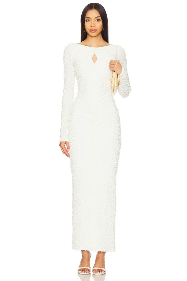 A sleek column silhouette in a textured crepe fabric defines this white maxi dress with long sleeves and a modest round neckline. The fitted cut and hidden back zipper emphasize an elegant shape, while a subtle front cut-out and back vent add modern, sophisticated touches. Fully lined for comfort, this dress transitions flawlessly across seasons and is perfect for cocktail parties, date nights, or upscale evenings out. Crafted from a viscose-polyester blend, it offers both stretch and structure for a flattering, all-weather wear.