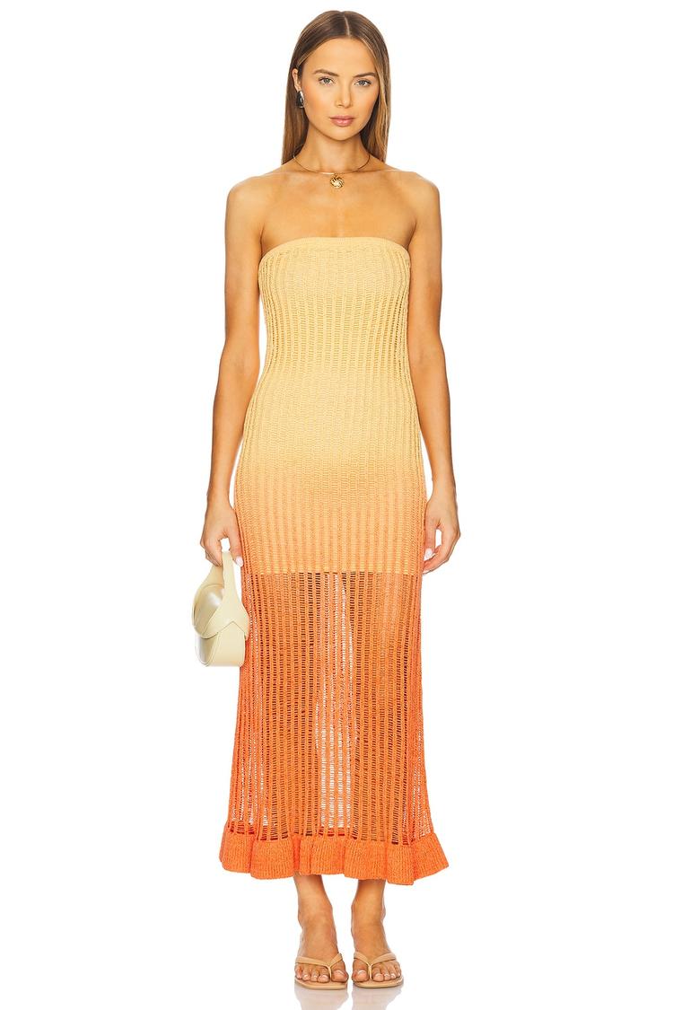Sun-drenched summer days and warm evenings come alive with this strapless slip dress featuring a slim, figure-hugging silhouette and a flowing maxi length. Crafted from a midweight open knit blend of cotton, polyester, viscose, and nylon, it offers breathable comfort and subtle texture. The ribbed and ruffled hem adds a playful bohemian touch, while the elastic neckline ensures a secure yet effortless fit. Ideal for brunch, beach vacations, and date nights, this dress balances casual chic with elegant ease for versatile warm-weather style.