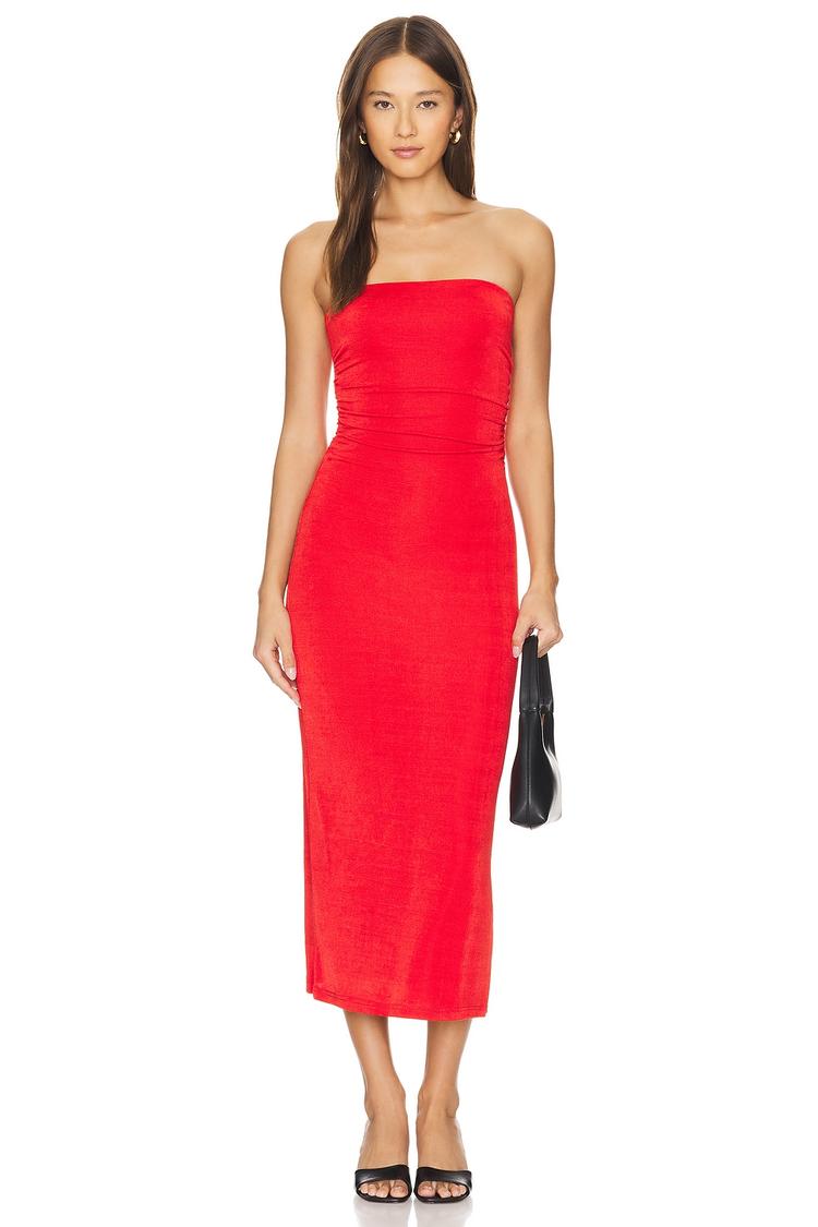 A vibrant bright red midi sheath dress showcases a strapless neckline with elasticized support and subtle ruching along the sides for a flattering bodycon fit. Crafted from a smooth polyester-elastane blend, this fully lined dress offers comfortable stretch and sleek silhouette perfect for date nights, cocktail parties, or evening outings. The clean hemline and slip-on design enhance its modern and sexy appeal, making it an effortless choice for versatile all-weather occasions.