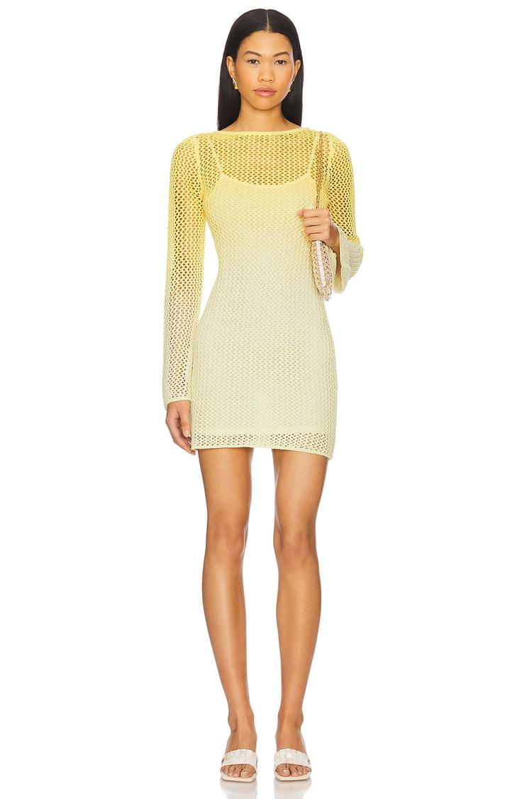 Lightweight yet structured, this mini dress features a heavyweight crochet fabric in a matte yellow hue that beautifully captures spring and summer vibes. The fitted sheath silhouette with long sleeves and a round neckline balances modernity and sexiness, while the open back adds an alluring touch. Fully lined with a detachable slip for comfort and modesty, its pull-on slip-on styling makes it effortless to wear. Ideal for brunches, night outs, or cocktail events, this dress blends breathable cotton and viscose for a chic statement look.
