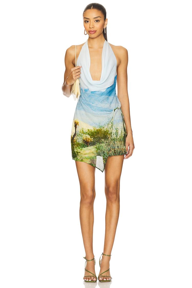 Soft crepe fabric and a plunging neckline shape a sleek slip dress that captures attention with its vibrant landscape print. The mini length and slim fit perfectly balance the flowing tie-up halterneck, creating a modern yet sexy silhouette. An asymmetric hem adds a playful edge to this versatile piece, ideal for spring and summer occasions. Whether you're heading to brunch, a date night, or a vacation getaway, this dress blends comfort and style effortlessly with its hidden back zipper and fully lined construction.