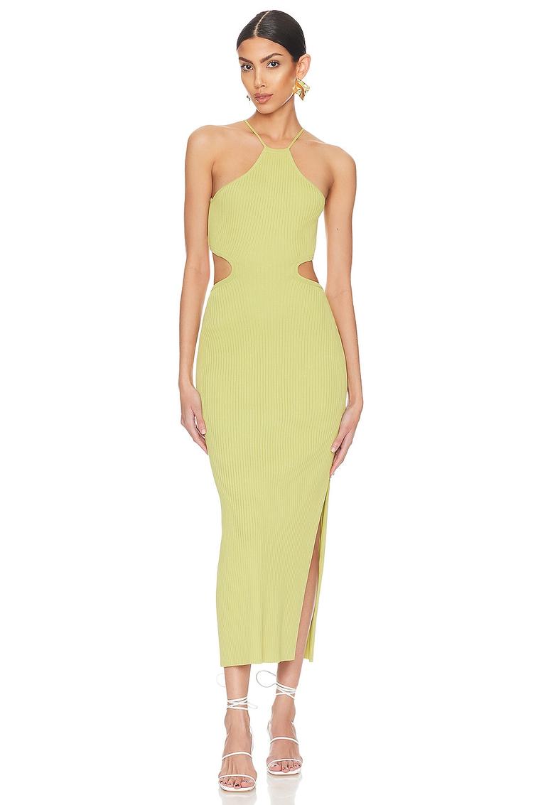 A sleek halter neck and figure-hugging sheath silhouette define this matte light green midi dress, crafted from a midweight ribbed jersey blend of viscose and nylon. The dress features bold waist and back cut-outs with dual tie closures, adding a modern edge to its fitted form. A side slit enhances movement, making it an ideal choice for spring and summer nights out, cocktail parties, or romantic dates. Its pullover styling and unlined fabric promise comfort without sacrificing style, perfect for those seeking a contemporary yet sexy look.