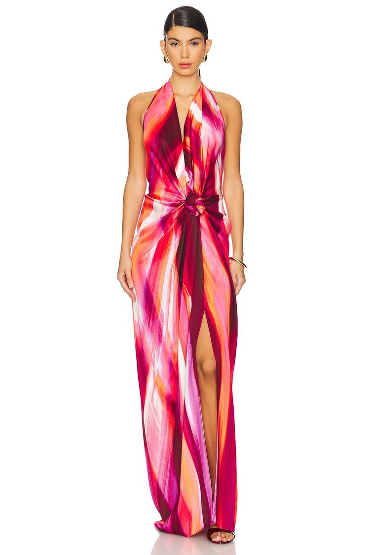 A vibrant abstract print in shades of pink, red, and burgundy sweeps across this flowing maxi column dress crafted from midweight crepe viscose. The halter neck with adjustable tie closure and open back creates a sleek, sexy silhouette complemented by a hidden back zip for a smooth finish. Its sleeveless and strapless styling enhance the slim fit, making it an ideal choice for spring and summer nights out, cocktail parties, or romantic dates. The clean hemline and front knit accent add subtle sophistication to this modern, elegant gown.