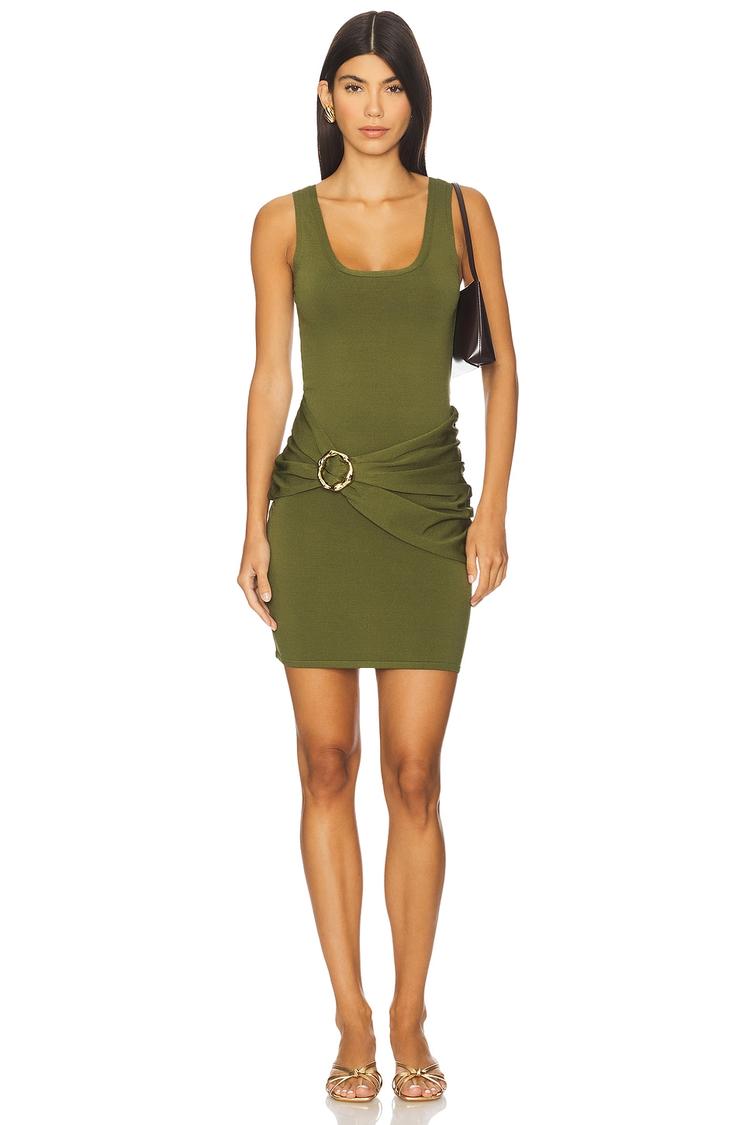 A sleek olive mini dress in a soft knit viscose blend offers a figure-hugging sheath silhouette with a flattering U-neck and sleeveless wide straps. The front features elegant draping and a gold-tone buckle detail that adds a touch of chic sophistication. With its clean hemline and slip-on style, this fitted mini is perfect for spring and summer nights out, cocktail parties, or intimate date nights. The fabric’s subtle stretch ensures comfort while maintaining a polished, minimalist look.